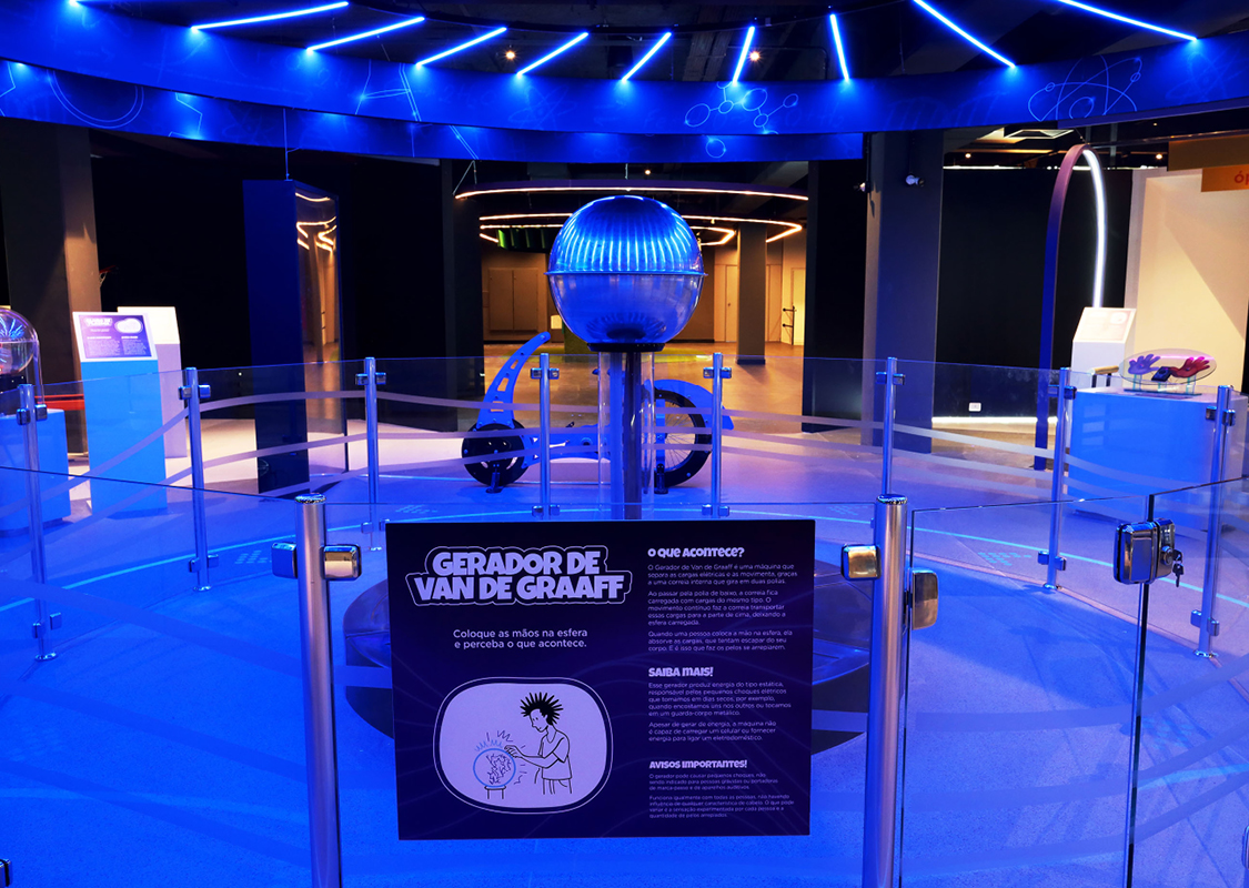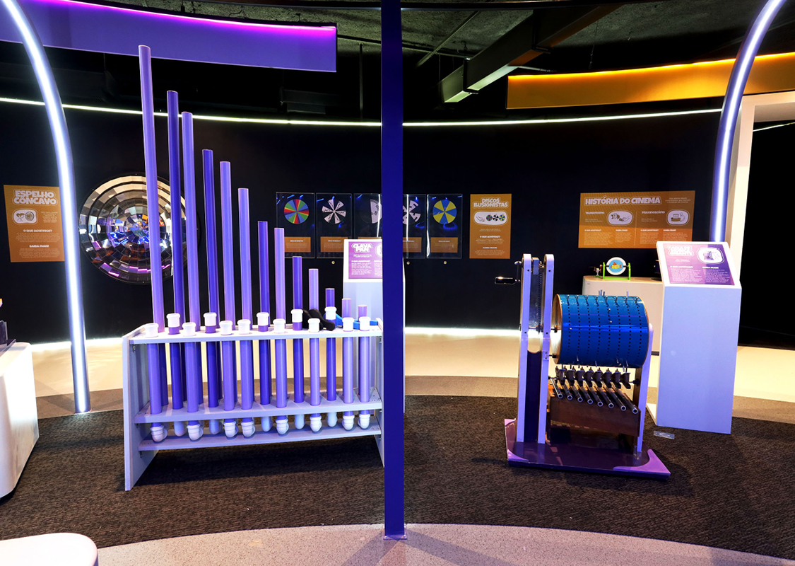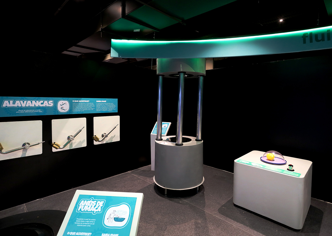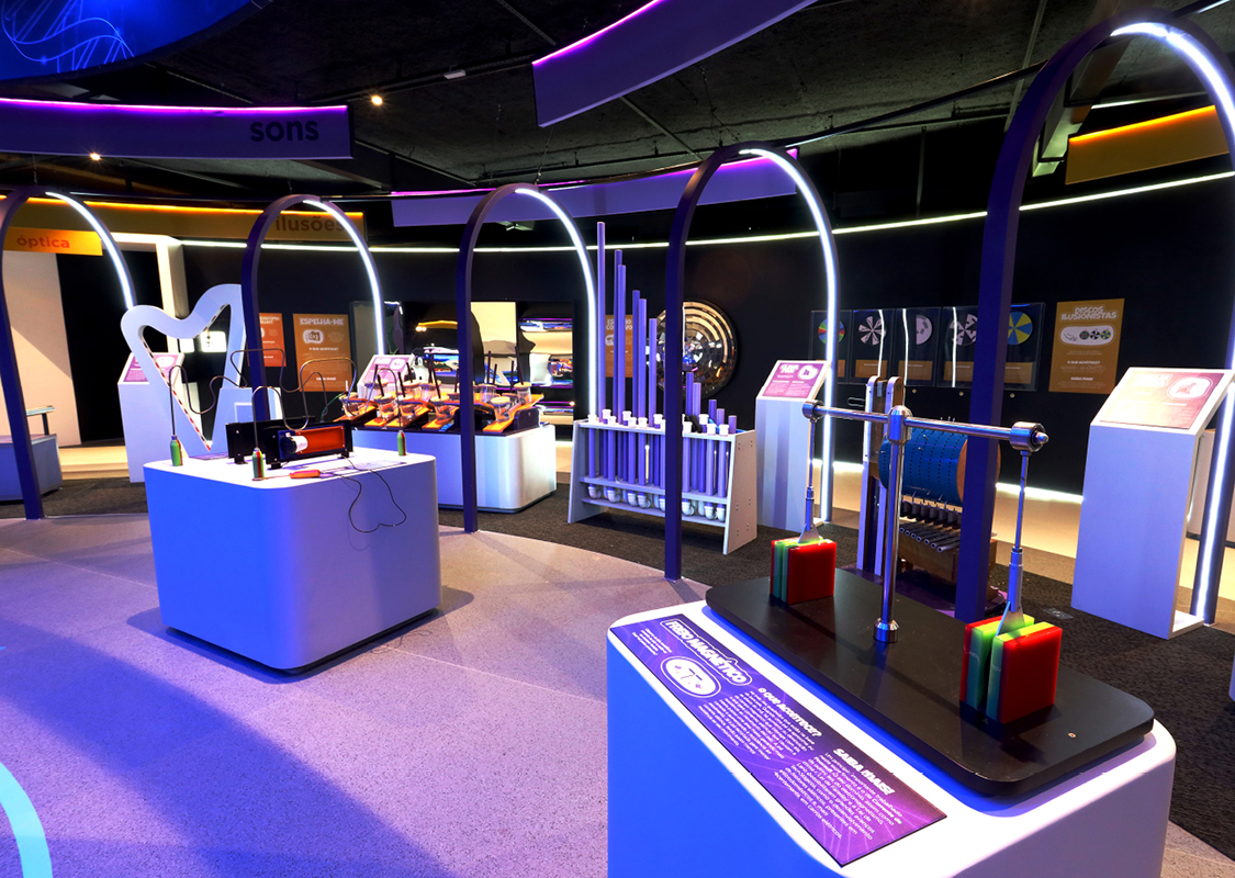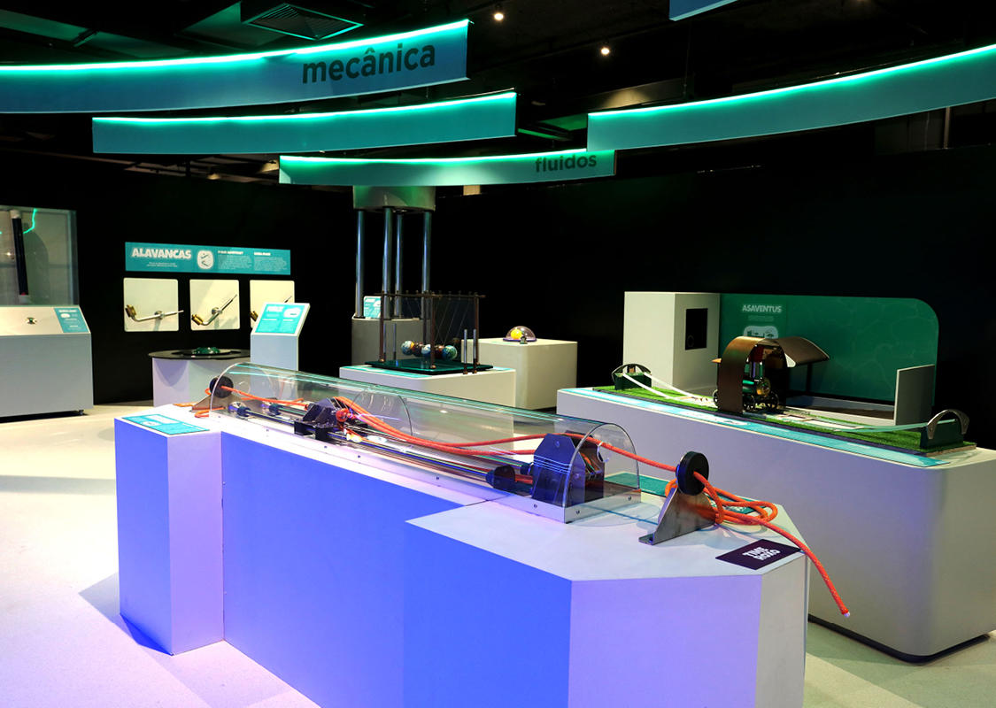 Todos os equipamentos carregam conceitos científicos e permitem a livre exploração de 5 diferentes frentes da ciência: Fluídos, Mecânica, Eletromagnetismo, Sons e Ótica.